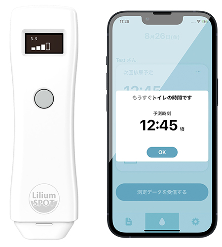 「リリアムスポット®2」の測定結果を、音波通信を用いてスマートフォン(iPhone)連携させることで、1回ごとの測定結果の記録のみならず、排尿前後で測定・記録することにより、尿産生スピードを計算し、次回のトイレタイミングの目安を通知します。