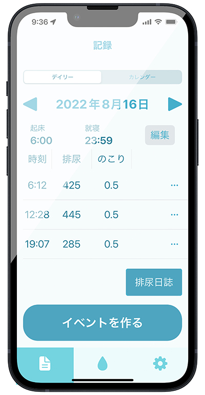 スマートフォンにインストールした「ノコポ®・パーソナル」を用いることで、毎回の排尿量を排尿前後2回の測定の差分で記録し、排尿後の尿のたまり具合の目安を記録することにより、排尿日誌として膀胱機能のアセスメントの参考にお使いいただけます。
